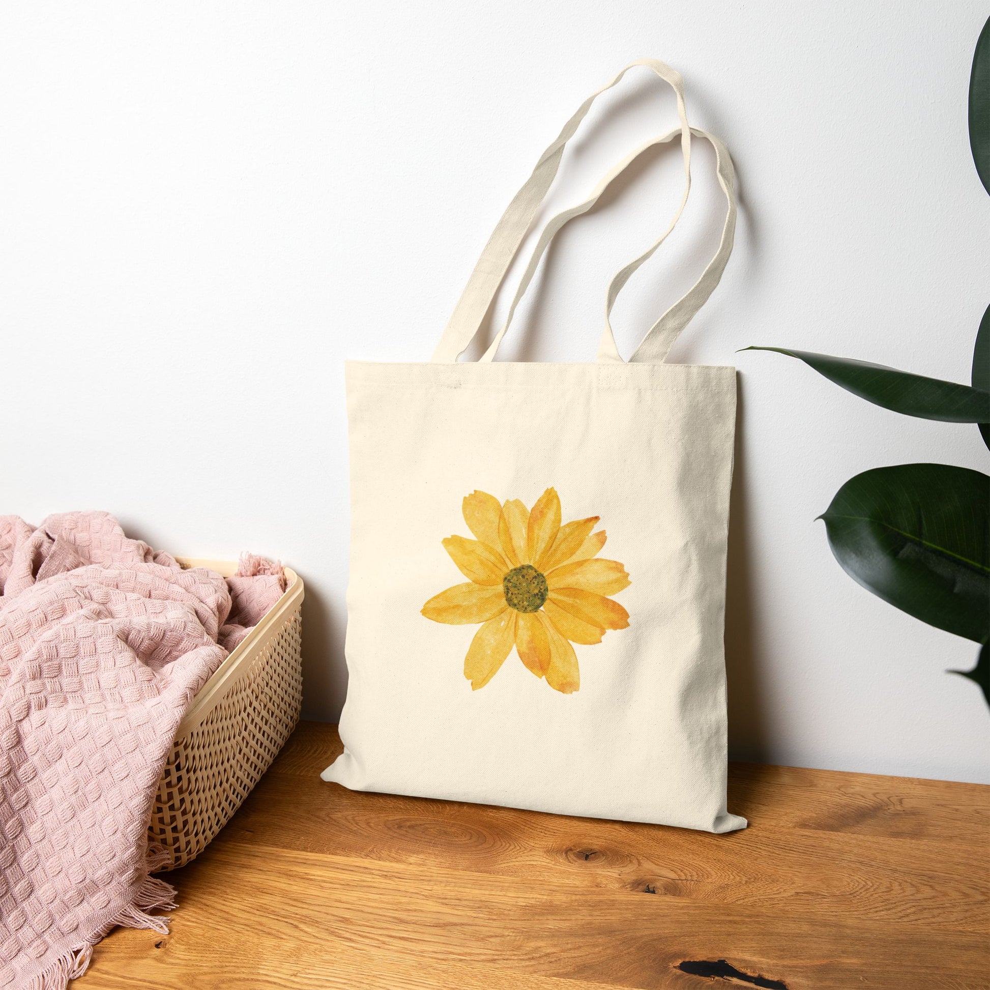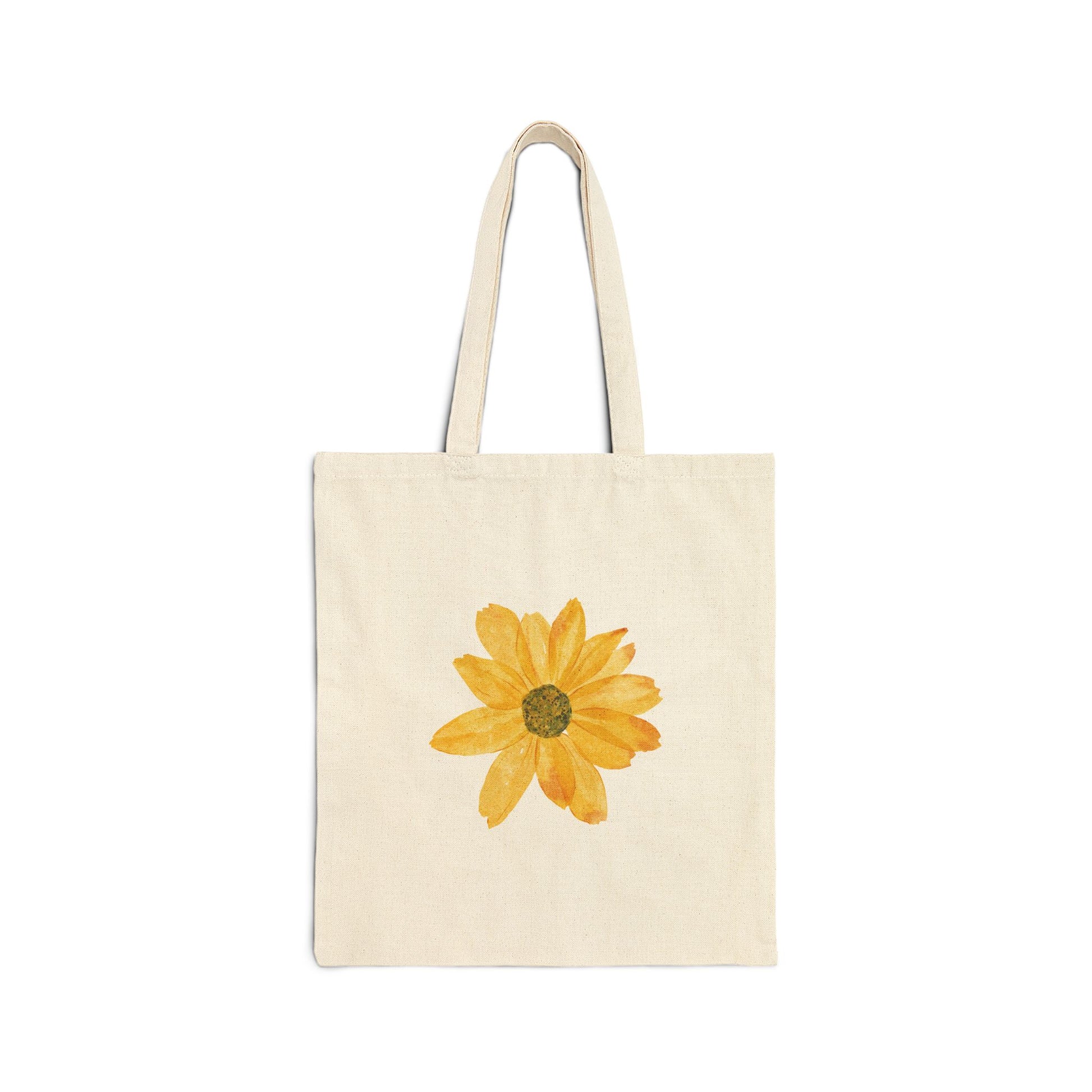 Lightweight-but-sturdy cotton canvas tote with a hand-painted sunflower at its center. The natural canvas and warm yellow bloom create an easygoing, sunlit vibe that feels like a fresh market morning. It carries groceries, notebooks, or beach reads without fuss and ages softly with use. The flat-sided construction keeps the silhouette slim and streamlined, while reinforced self-fabric handles stand up to daily wear. Carry it on neighborhood walks, to farmers’ markets, or tucked over your shoulder on a sunny weekend — this tote feels like a small, cheerful ritual you reach for again and again.